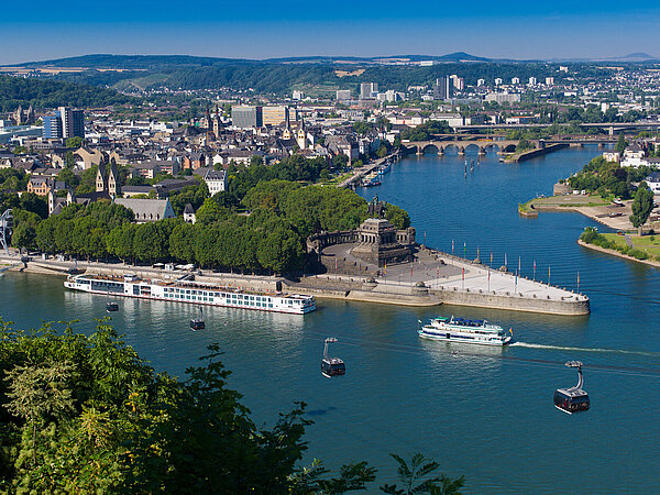 The German Corner in Koblenz is one of the most famous landmarks along the Moselle Cycle Path, marking the confluence of the Rhine and Moselle rivers. The site owes its name to the Teutonic Order, which settled here in the 13th century. The monumental Emperor Wilhelm statue dominates the area and is a popular photo spot. Visitors can enjoy stunning views of both rivers from this point. The riverside promenade invites you to relax and take a break. Koblenz itself features a lively old town with many attractions. A perfect highlight or finale of any cycling tour.
