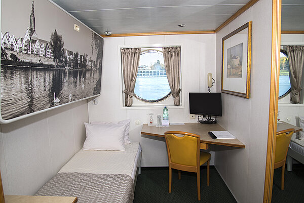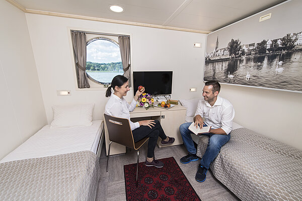 Die großzügigen Kabinen am Ober- und Promenadendeck sind ca. 16,5 m² groß und verfügen über 2 zusammenstehende Betten, einen Schreibtisch sowie einen Balkon mit Sitzbank. Am Oberdeck befindet sich zusätzlich ein Sofa, am Promenadendeck 2 Sessel in der Kabine.